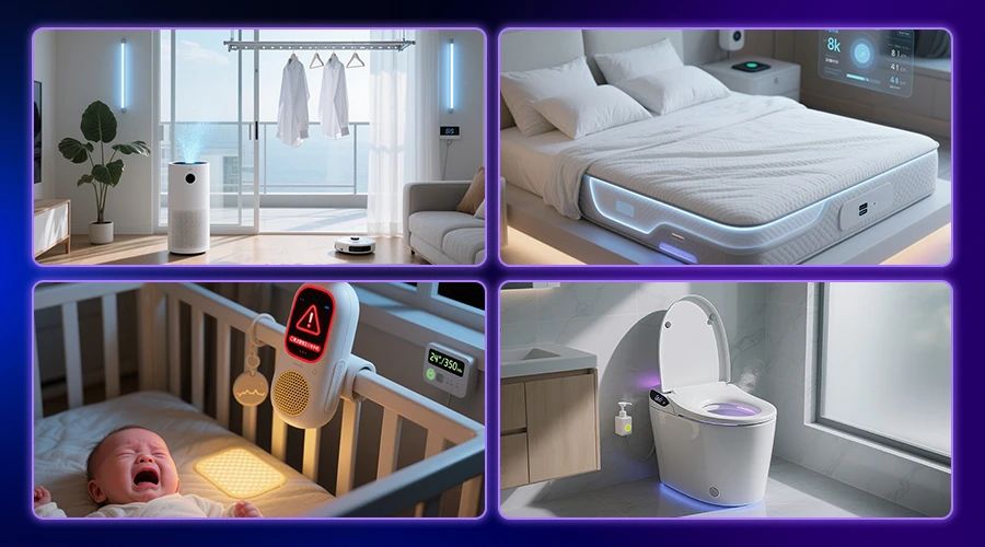 支持离线语音控制)和健康与睡眠监测设备(如智能枕可识别鼾声联动调节环境,婴儿监护器能