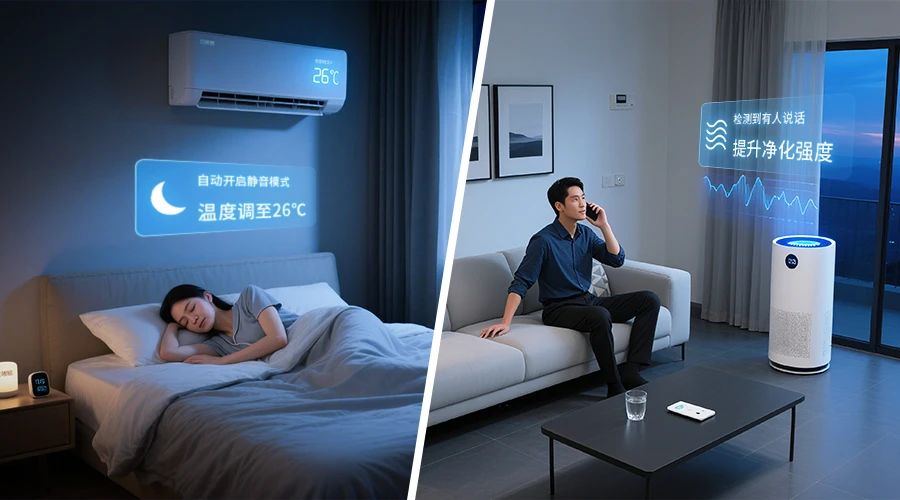 动调节运行模式。如检测到 “睡眠(鼾声)” 时,空调自动调低风速、静音并调温;空气