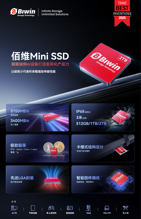 《TIME》评价指出,佰维Mini SSD成功打破了性能与便携性之间的壁垒,是应对“设备日益轻薄、数据持续激增”这一行业挑战的典范之作,为AI